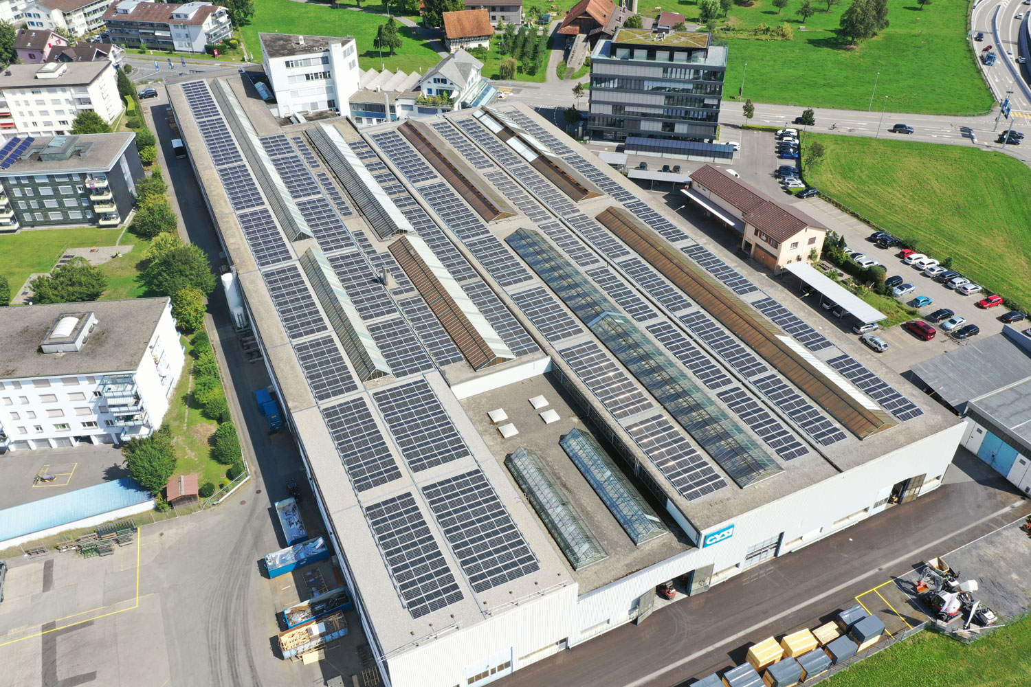 Photovoltaik-Anlage mit 708 kWp. Die 1864 Module ermöglichen eine CO2-Einsparung von 260 Tonnen jährlich.